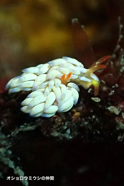 | 水温の低下とともに一気にウミウシが増えすぎ? ですが透明度は良好です。 (^o^)。 画像の無いものを入れると 一日で20種近く見られました。 |